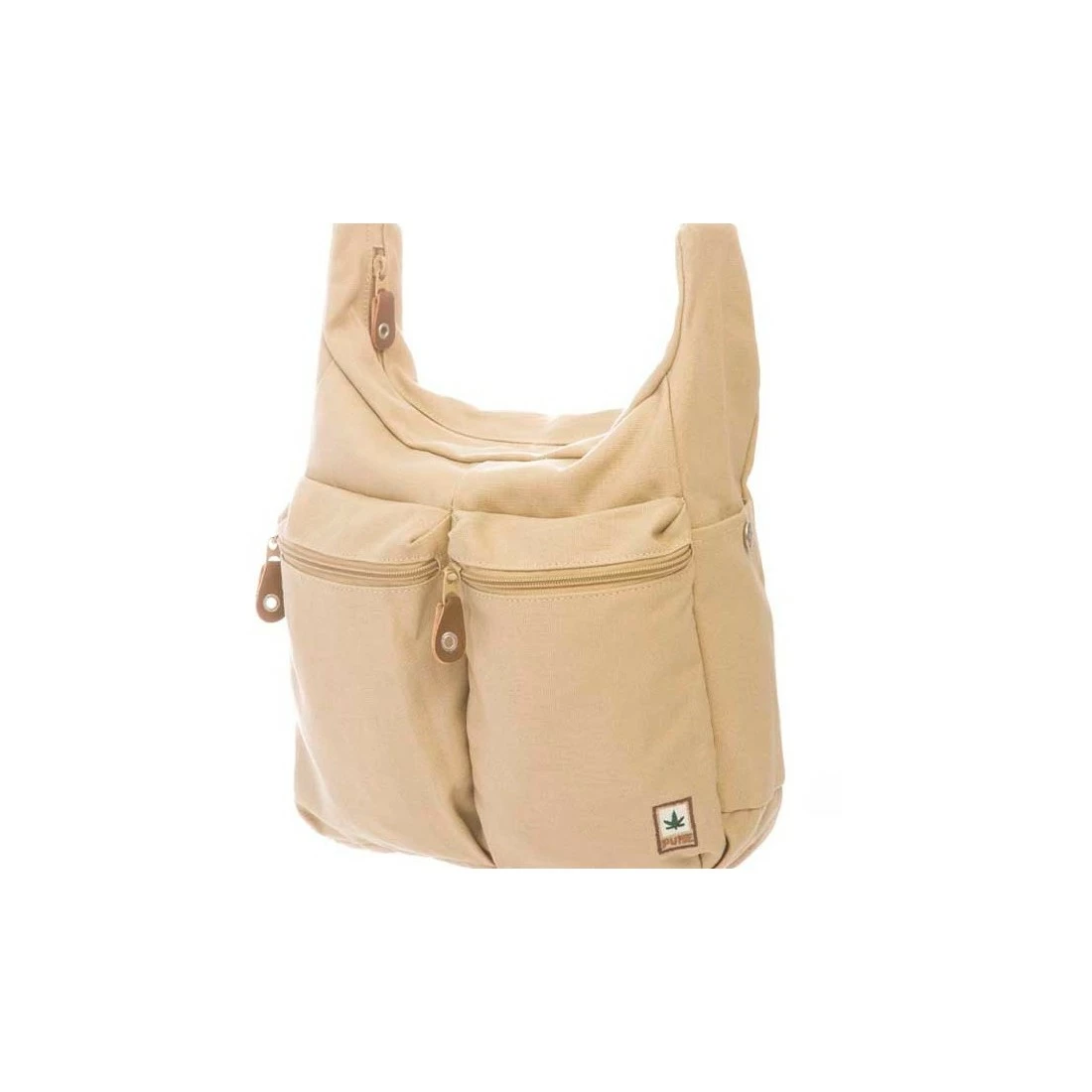 Bolso de hombro de cáñamo y algodón orgánico. Consta de un compartimento principal con un pequeño bolsillo con cremallera en el interior. En el frente de la bolsa, dos bolsillos con cremallera, dos bolsillos en la presión del lado y, finalmente, en el bolsillo trasero de un largo zippée.Sangle ajustables, tiene un poco de cuero cremalleras cierres.