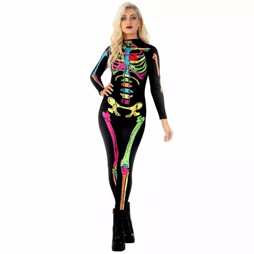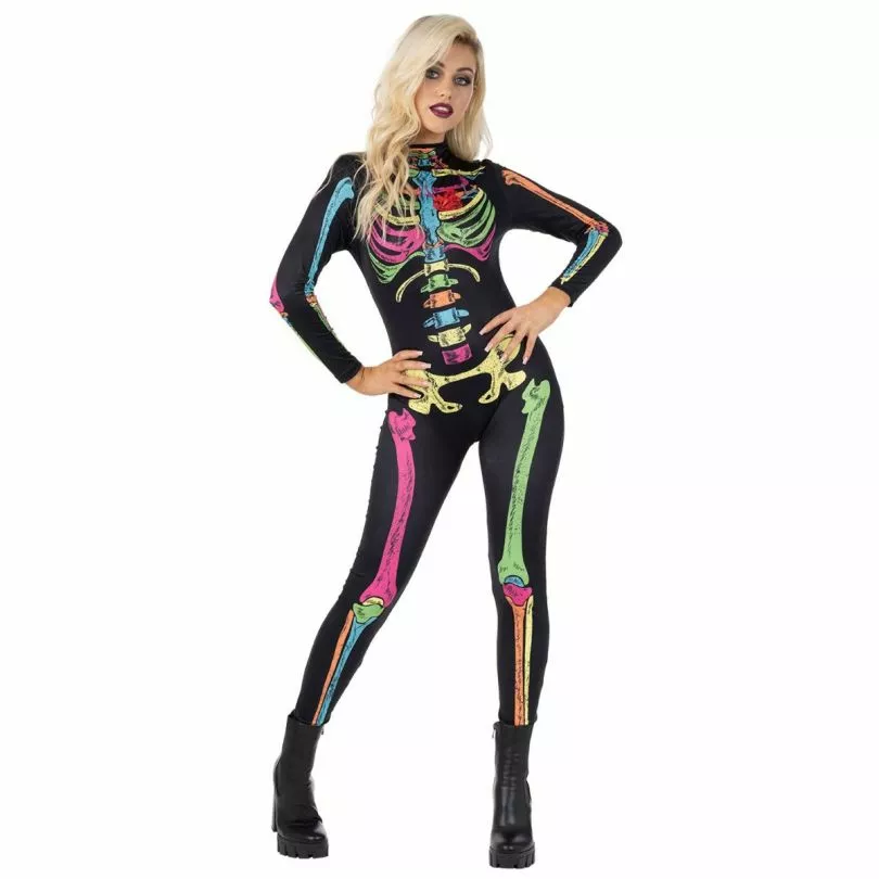 El producto incluye: Body estampado.Este disfraz de adulto está disponible en tallas: S, M, L y XL. Por favor, diríjase a la gráfica incluida en las fotos para más información de las tallas.Disfraz cómodo de llevar, resistente y de excelente calidad.Cuello alto, con cremallera trasera y estampado por delante y por detrás.Nuestra empresa fue fundada en 2009 por 3 amigos apasionados por los disfraces.Tenemos oficinas en US,UK y Europa.Contamos con cientos de disfraces,diseñados y confeccionados con la más alta calidad.Perfecto disfraz de esqueleto de colores para Halloween, fiestas temáticas de terror. Ideal para carnavales, cosplay de calavera y huesos sensual y mucho más!