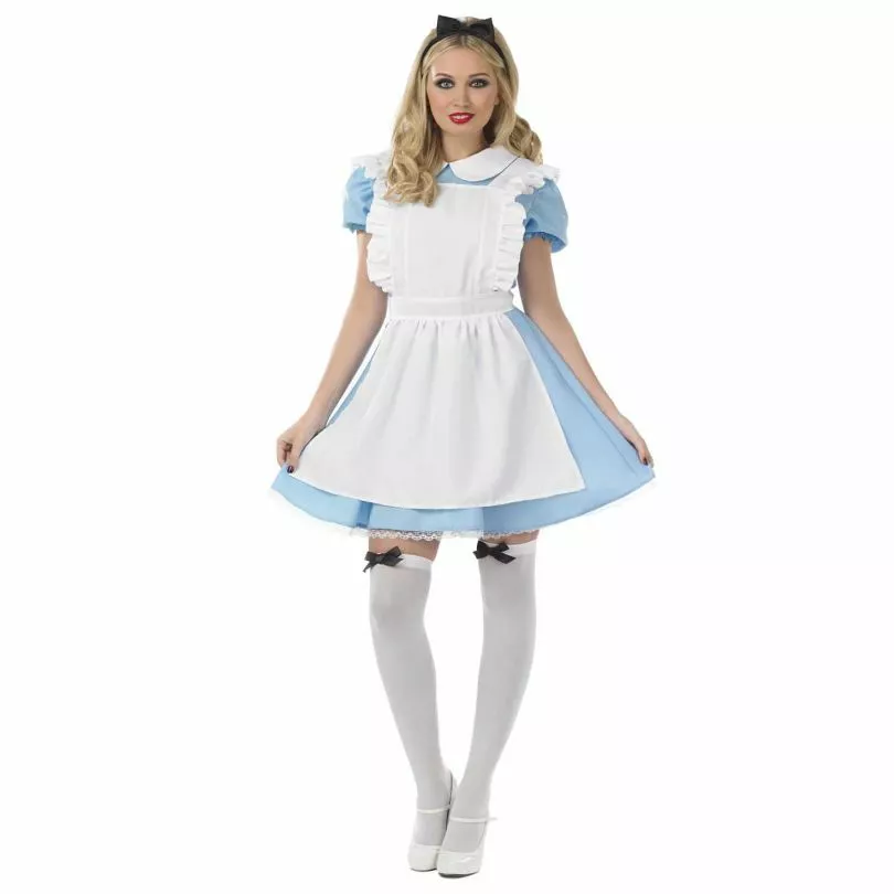 El producto incluye: Vestido azul claro, delantal blanco con volantes, calcetines hasta la rodilla con lazos negros y una diadema negra con lazo. Este disfraz de adultos está disponible en tallas S, M, L y XL. Por favor, diríjase a la gráfica incluida en las fotos para más información de las tallas. Disfraz cómodo de llevar, resistente y de excelente calidad. Nuestra empresa fue fundada en 2009 por 3 amigos apasionados por los disfraces.Tenemos oficinas en US,UK y Europa.Contamos con cientos de disfraces,diseñados y confeccionados con la más alta calidad.Perfecto disfraz de Alícia para carnavales y fiestas temáticas del cuento de Lewis Carrol. Ideal para Halloween, Cosplay de las aventuras de Alícia y mucho más!