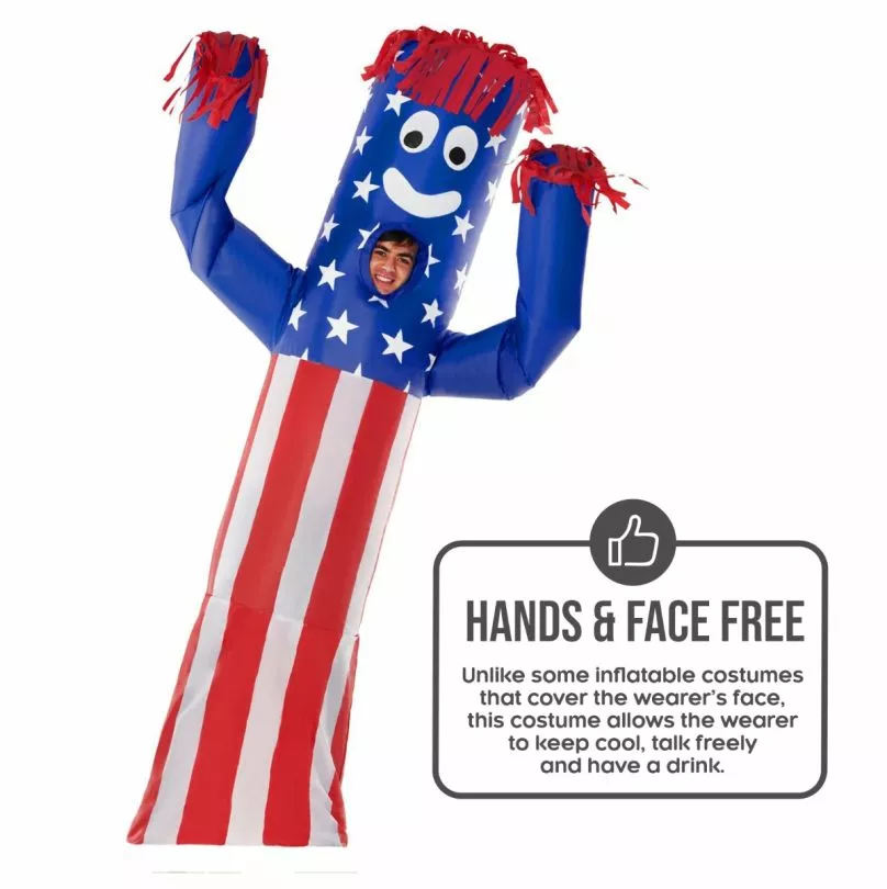 Con este divertidísimo disfraz, podrá convertirse en uno de esos bailarines hinchables que se ven en los garajes de Estados Unidos. Este genial disfraz hinchable está destinado a provocar risas y alegría allá donde lo lleves. Cada disfraz viene con un ventilador a pilas para inflarlo (requiere 4 pilas AA: no incluidas).