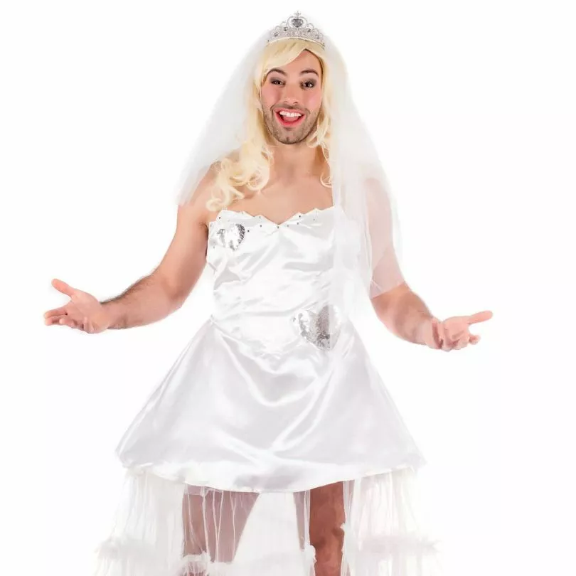 MENS RUN AWAY BRIDE COSTUME: It’s a nice day for a white wedding & this long flowing gown is ideal for any stag wanting to really get into the wedding spirit. The tiara & veil take this outfit to the next level.