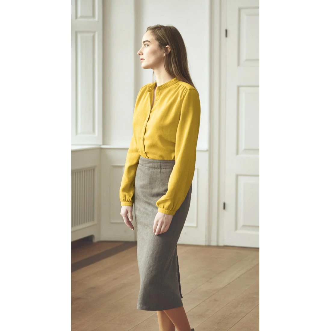 Camisa de mujer con cuello redondo abotonado estilo mao, espalda más larga y redondeada, mango ligeramente hinchado en la muñeca, botones de nácar. Será perfecto para cualquier ocasión, con vaqueros o falda.