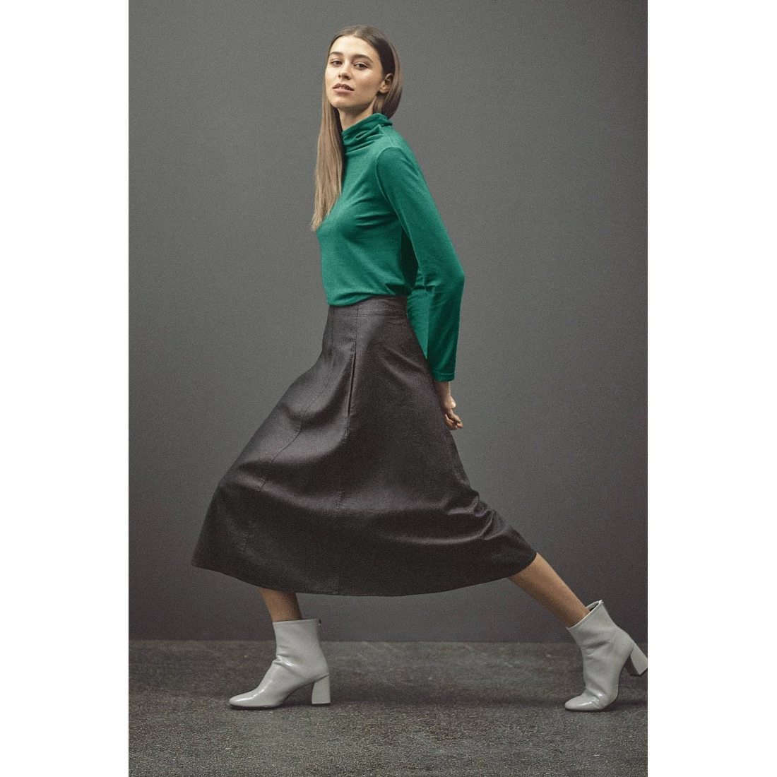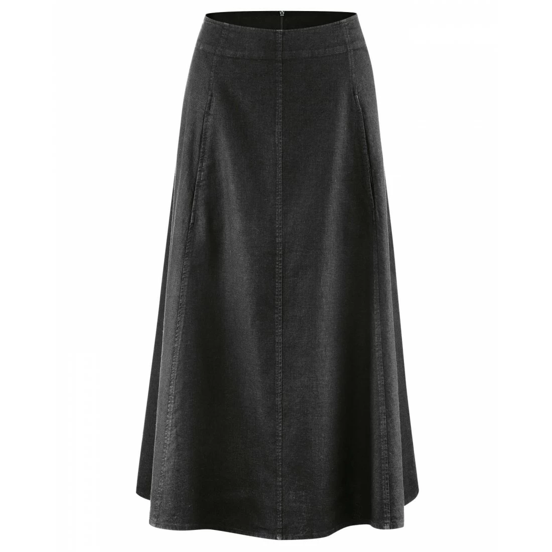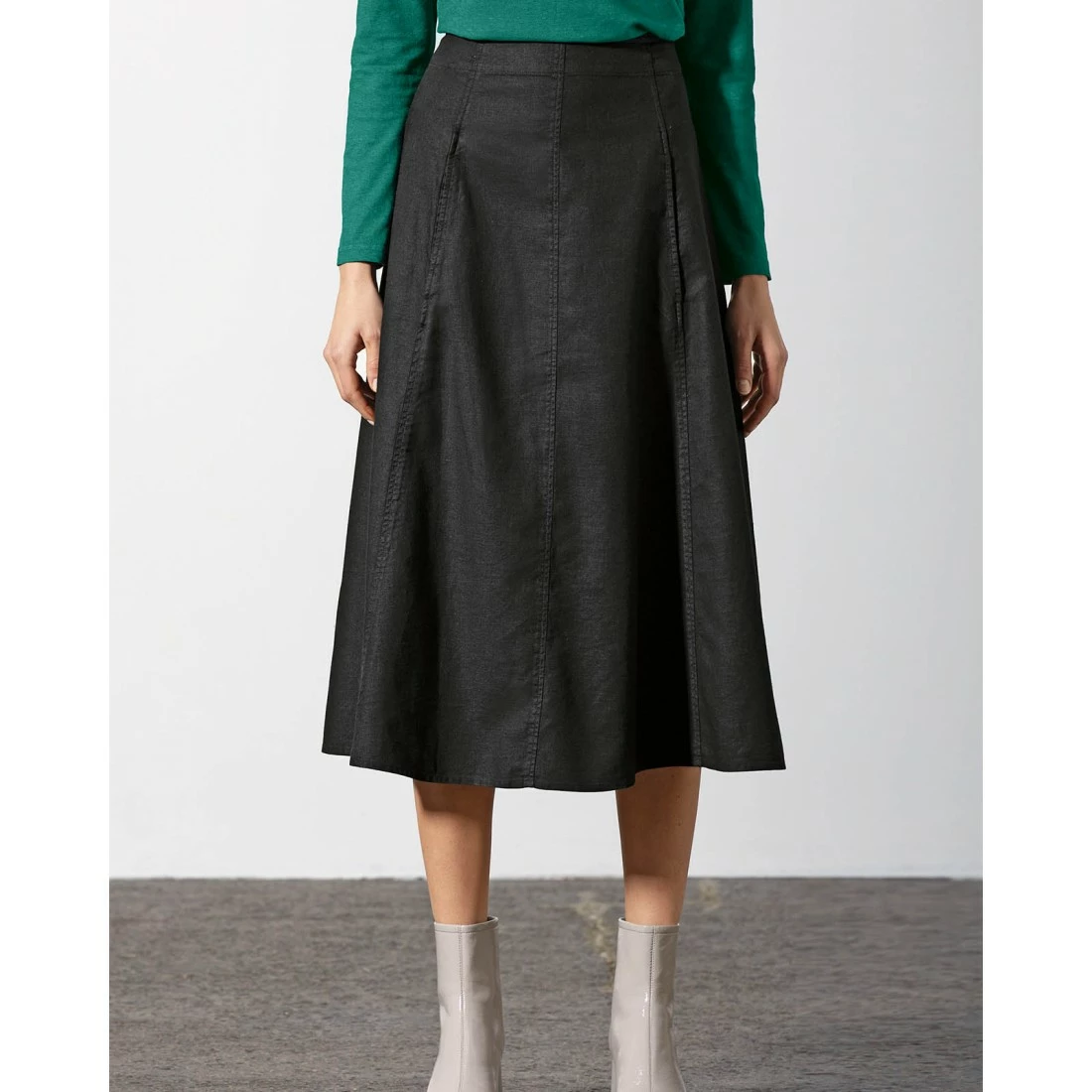 Falda larga de trapecio, vegana con bolsillos en la parte delantera, costuras decorativas que resaltan.