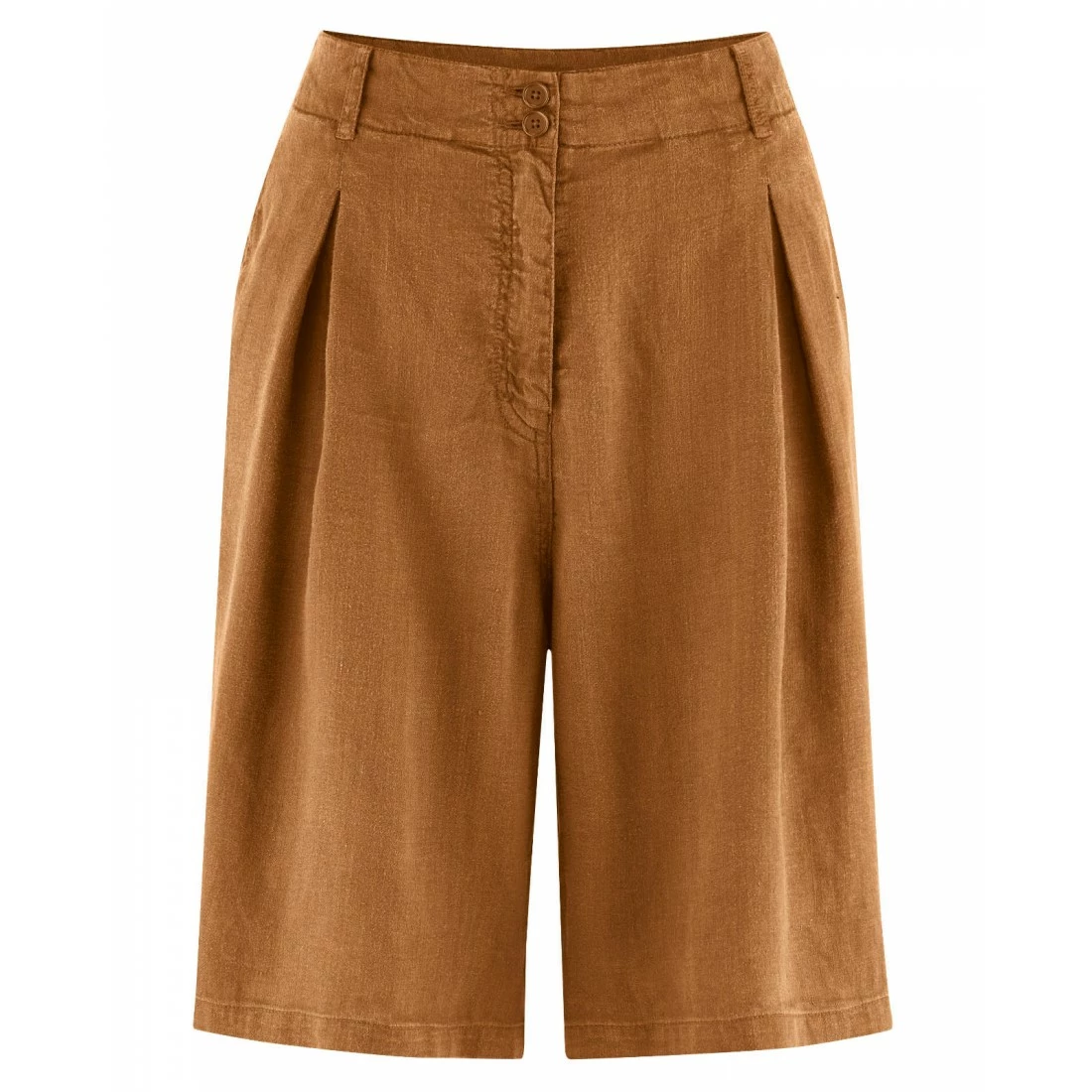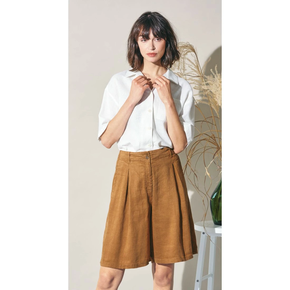 Pantalones cortos largos con pliegues huecos, botones de coco, bolsillos laterales y tuberías en la espalda.