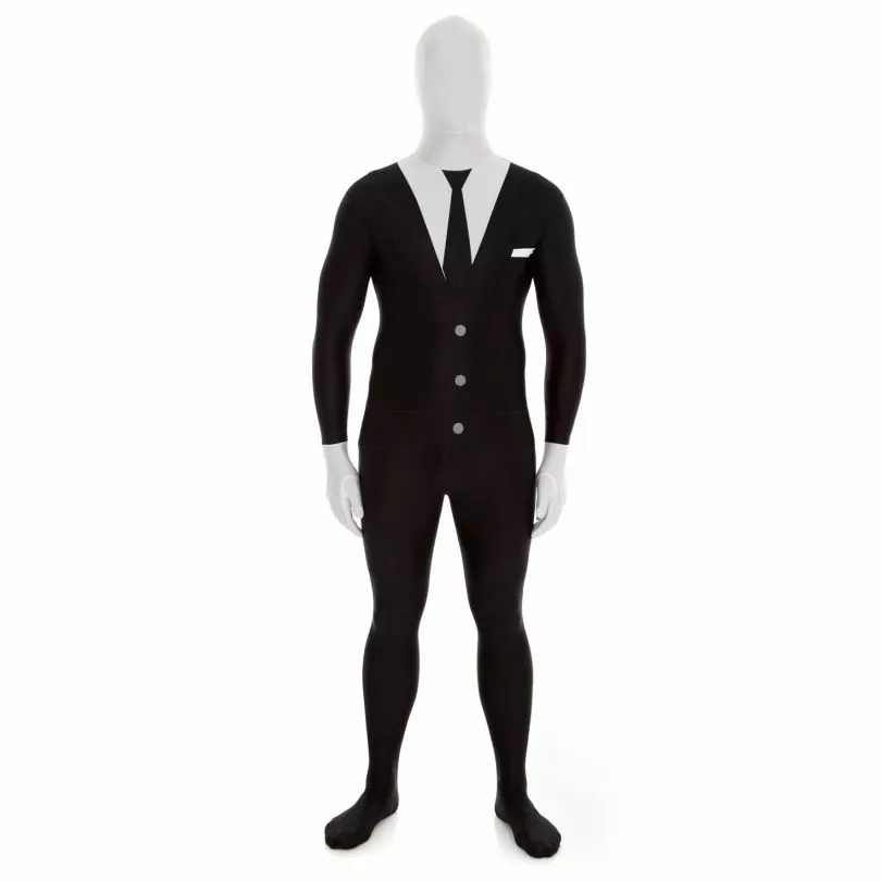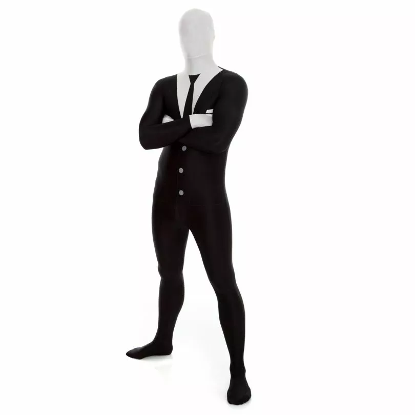 Morphsuit de Hombre Delgado. El Hombre Delgado es uno de los personajes de culto más controvertidos para disfrazarse. Por si no lo sabes El Hombre Delgado es un hombre alto y delgado que lleva un traje negro y tiene la cara completamente blanca. Según la leyenda puede estirar o acortar sus brazos – también hace que la gente se cague en los pantalones.Para aquellos de vosotros que no sabéis quién es el Hombre Delgado y simplemente queréis un traje guay para la graduación o para vuestro primer día en vuestro nuevo trabajo ¡también viene bastante bien para eso!La doble costura en todo el interior del traje asegura la durabilidad mientras que dos cremalleras te permiten quitarte el traje rápida y fácilmente. Nuestra mezcla especial de materiales asegura una visión clara y el 13% de Spandex significa que además de ofrecer un gran ajuste (a diferencia de nuestros competidores que son pantalones) es muy cómodo también. Ve delgado a Halloween al carnaval o a uno de esos festivales a los que la gente parece siempre ir.”